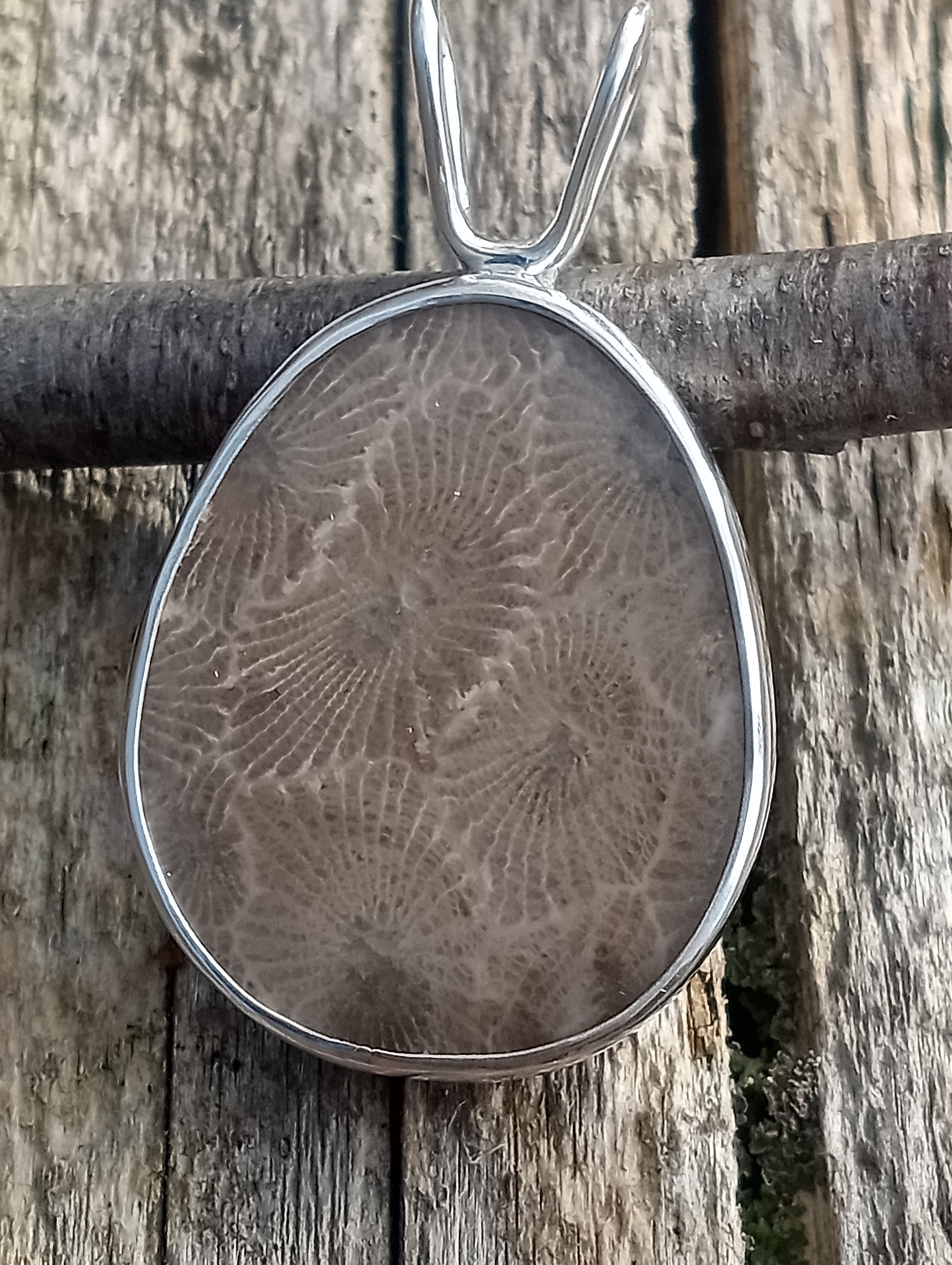 Just finished this beautiful piece. I cut and polished this Petoskey stone this summer . Finally set it. As always melted and milled by hand in a setting sustainably handcrafted from pure .999 fine silver. This stone is exceptional and vivid the photos are in cloudy light and the one in my hand is sunlight . I hope you enjoy this beautiful piece. Be a creator.