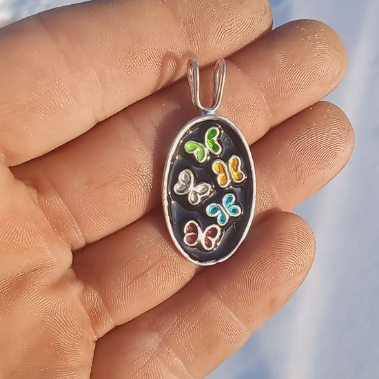 Here for you today is something I have never posted before this is my first piece of cloisonne a very ancient form of enameling . I have always loved cloisonne . This is sustainably handcrafted from pure .999 fine silver . This pendant features five butterflies each in an individual color . I truly hope you enjoy this piece . It's a labor of love for sure . Be a creator.