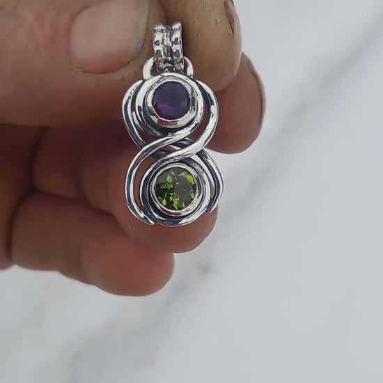 Peridot and amethyst fine silver pendant