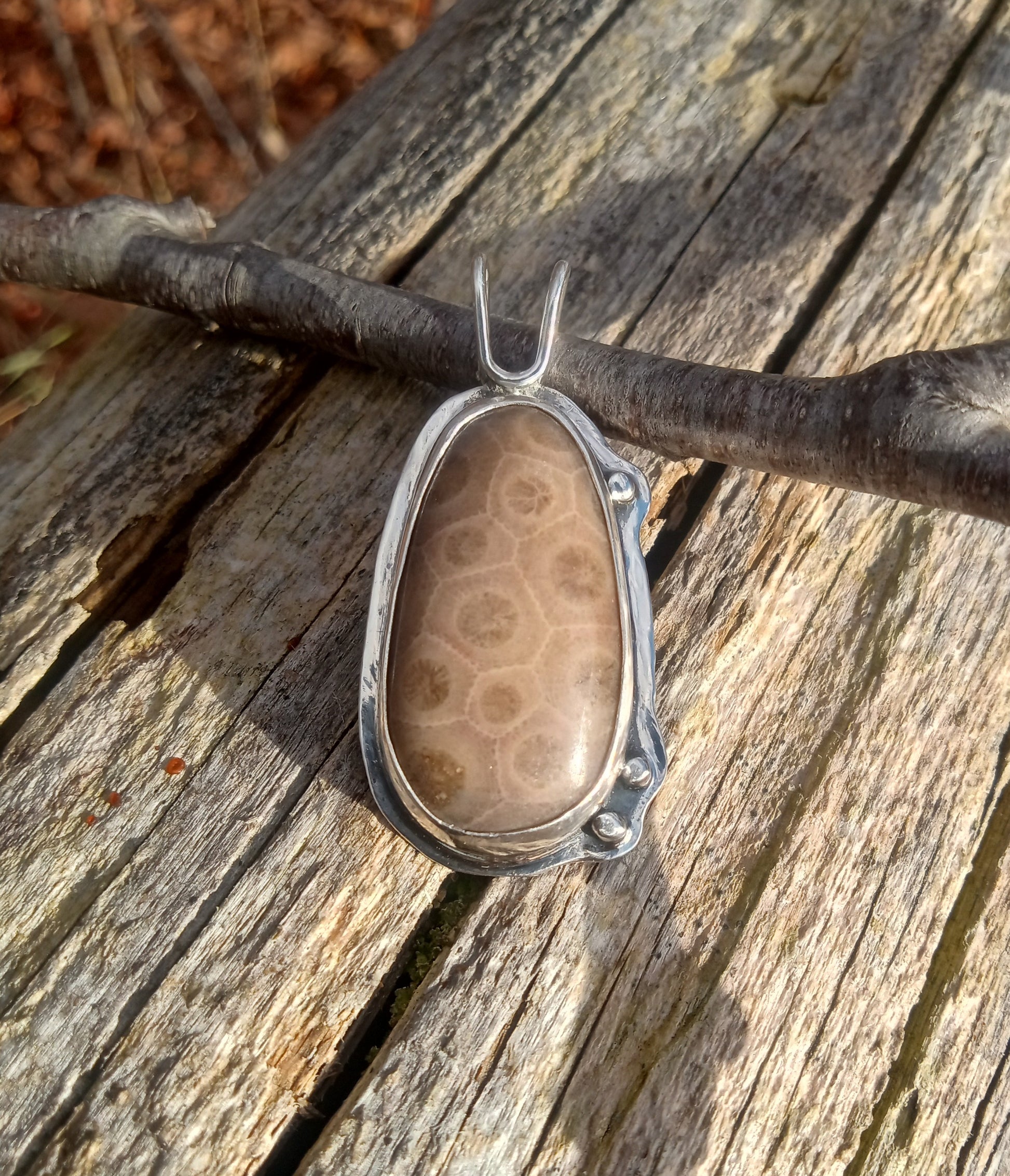 This is a very rare Petoskey stone this is a "pink Pete" back when the coral was calcifying iron permeated the Petoskey stone to create pink hues . The largest one in Michigan sold at state auction for $3 million dollars wowza! Hope you enjoy this sustainably Handcrafted pendant made of hand milled pure .999 fine silver . Be a creator.