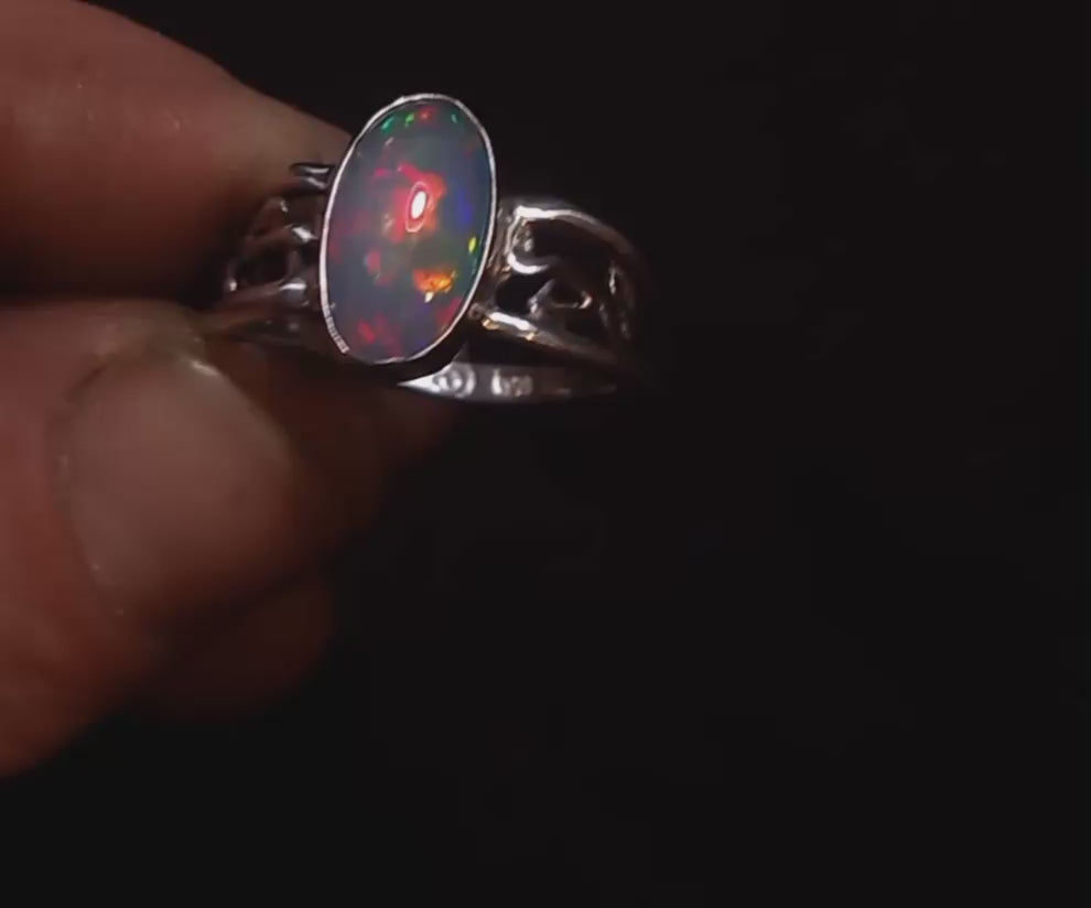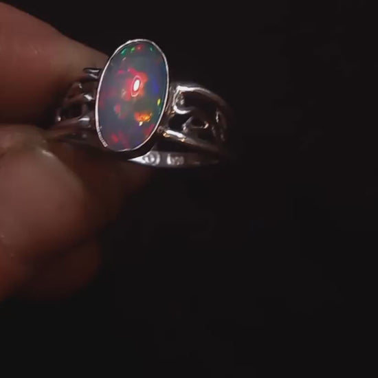 Here is one of my finest rings yet I'd say . This has an absolutely premium top class opal with extremely vivid flash with all the colors of the rainbow. This is a piece to have down for generations to come . Sustainably handcrafted from pure .999 fine silver . This ring is a size 9.5 with beautiful vines in the ring shank sides . This is one very special piece. I hope you enjoy this ring as much as me . Be a creator.