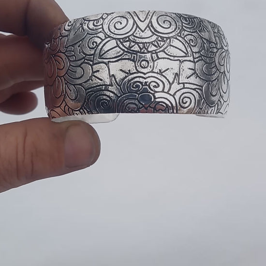 Fresh off my bench today . This is an absolutely beautiful cuff . Entirely embossed with exquisite patterns . Sustainably handcrafted from pure .999 fine silver . This cuff is sure to get attention on your wrist . I'm overly pleased with this piece. I hope you enjoy it. Be a creator.
