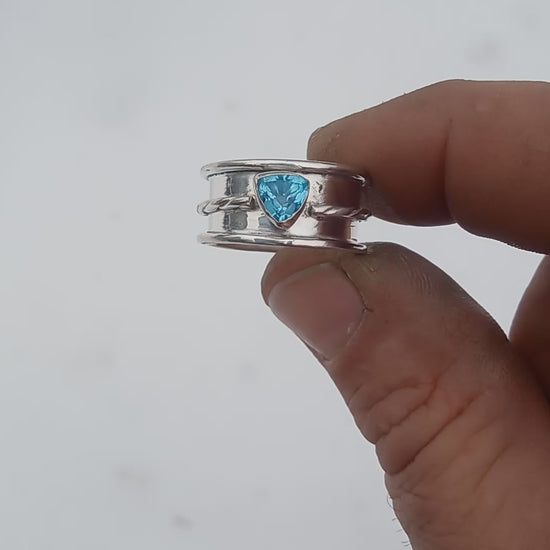 Well this ring came out absolutely amazing. I truly love this one . The gem is a swiss blue .81 ctw trillion cut topaz . The setting as always is sustainably handcrafted from pure .999 fine silver . This is a size 9 . The topaz is just so vivid and bright on this ring . I truly hope you enjoy. Be a creator.